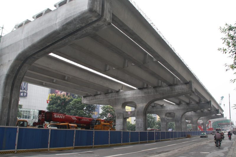 二環(huán)路東段改造工程路面施工,施工時(shí)間為2012年5月到2013年7月,投資為4.97億元,該工程北起二環(huán)路北府河橋東側(cè),向東經(jīng)商貿(mào)大道、火車北站、雙橋子立交,南止于二環(huán)路南府河橋東側(cè),全長(zhǎng)13.1公里。為“連續(xù)高架快速路+地面城市主干路”,底層道路按照雙向6-8車道建設(shè),高架快速車道為雙向6車道,路面面積80.43萬m³。主要工程內(nèi)容包括:瀝青砼路面鋪裝(含噴砂打毛和防水層)、底層道路路面施工(含底基層、基層、面層、路緣石等附屬工程)
